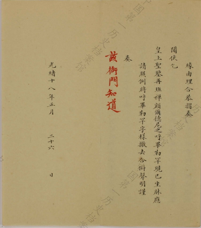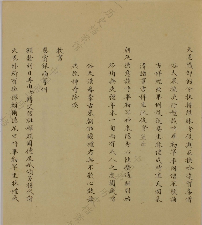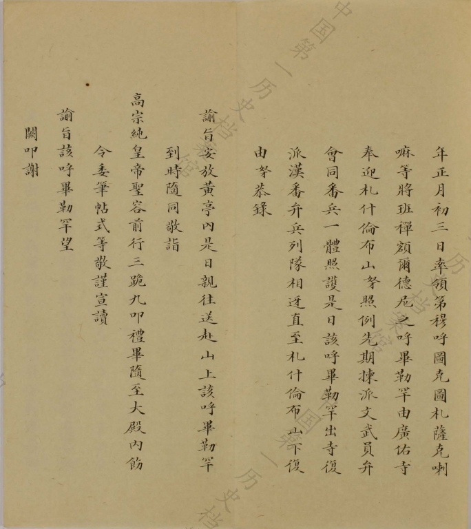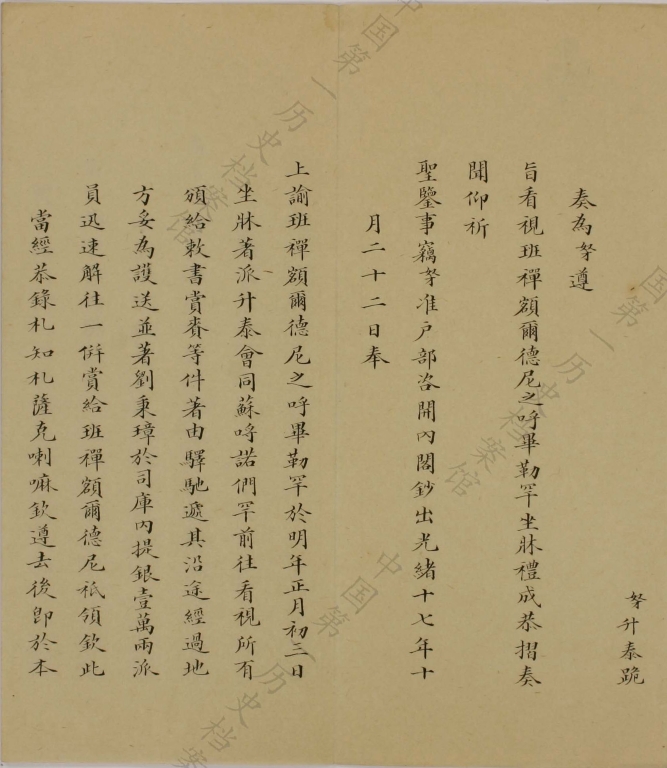 On the 3rd day of the 1st Month of 1892, the enthronement ceremony of the Qubilgan of the Eighth Panchen Erdeni was held at Tashilhunpo Monastery. The Qubilgan, therefore, took the throne as the Ninth Panchen Erdeni. Emperor Guangxu bestowed upon him 10,000 taels of silver and ordered the Amban Shengtai to oversee the ceremony. This is the memorial from Shengtai reporting in detail the enthronement to the Emperor. (Damzin Tashi)