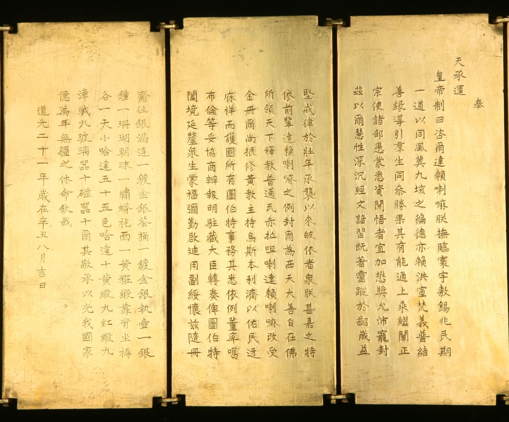 On the 16th day of the 4th month of the 22nd year (1842) under the reign of Emperor Daoguang, the Qubilgan of the Tenth Dalai Lama got enthroned at Potala Palace as stipulated by the Imperial Edict. The Fifth Changkya Hutuktu, the Amban and other officials oversaw the ceremony under the edict, and read the album and bestowed upon him the seal. This is the golden album granted the Eleventh Dalai Lama upon his enthronement by Emperor Daoguang. (Zhang Li)